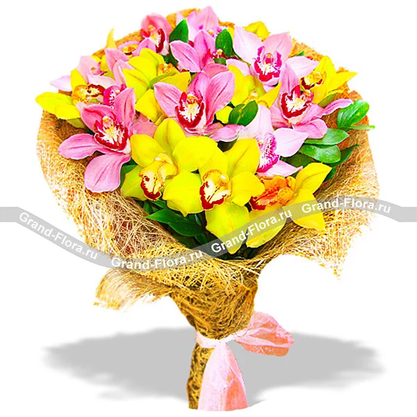 Ах, сколько романтизма и невинности в этой композиции из желто- розовых орхидей. Волнующий аромат, изысканная форма, роскошное сочетание – идеальны для подарка сильной, но в тоже время тонко чувствующей личности.