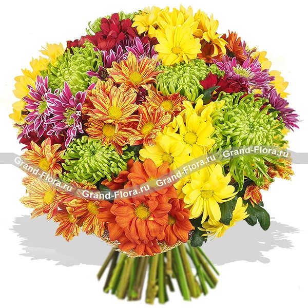 В букете «Осенний блюз» собраны самые разные сорта хризантем, но и это не главное, что привлекает в нем. Только взгляните на это сумасшествие ярких красок, они вызывают только позитив и поднимут настроение в серый пасмурный день. Именно поэтому наша международная служба доставки цветов предлагает вам этот букет хризантем с доставкой, чтобы ваши близкие всегда улыбались!