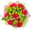 Уменьшенный: гвоздика красная - 5 шт., хризантема кустовая зеленая - 3 шт., декоративная зелень, фетр зеленый и красный.