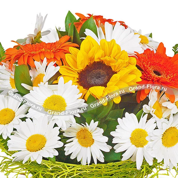Стандартный (на фото): ромашка белая - 15 шт, гербера оранжевая - 3 шт, подсолнух - 1 шт, рускус, папоротник - 5 шт, сетка зеленая.