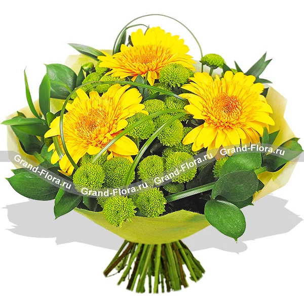 Уменьшенный: гербера желтая - 3 шт., хризантема кустовая зеленая - 2 шт., берграсс, фетр зеленый.