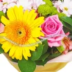 Уменьшенный: роза розовая - 3 шт, гербера желтая - 1 шт, альстромерия розовая - 2 шт, хризантема кустовая зеленая - 2 шт, хризантема кустовая светлая - 1 шт, рускус, фетр желтый. Примерный размер: 20Х20 см.