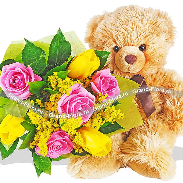 Стандартный: роза розовая - 6 шт., тюлпаны желтые - 5 шт., солидаго - 4 шт., декоративная зелень, фетр желтый + мягкая игрушка "Медведь" - 25-30 см.