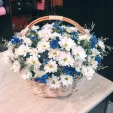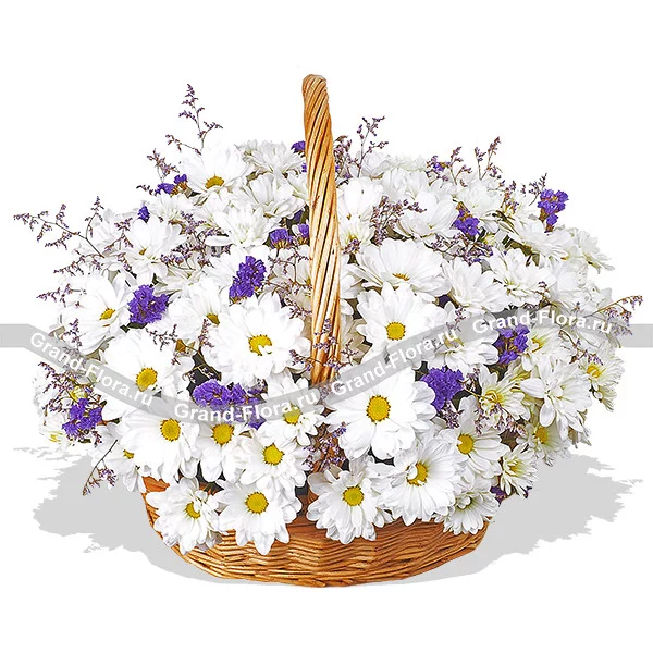Стандартный: хризантема белая кустовая ромашковидная - 9 шт., статица - 4 шт., декоративная зелень, оазис, корзина средняя.