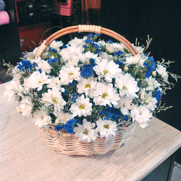 Букет из хрупких цветов, помещенный в плетеную корзинку, является не только чрезвычайно привлекательным, но и оригинальным презентом. Изящные белоснежные хризантемы подойдут к любому торжеству, будь то свадьба друзей, юбилей или день рождения любимой девушки. Также букет станет великолепным решением для вручения маме или сестре на 8 марта.
