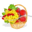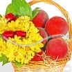 Уменьшенный: хризантема желтая кустовая - 1 шт., рускус - 2 шт., оазис, сетка, красная лента, корзина малая, персики - 1 кг.