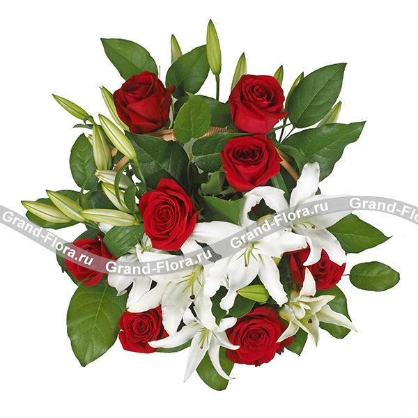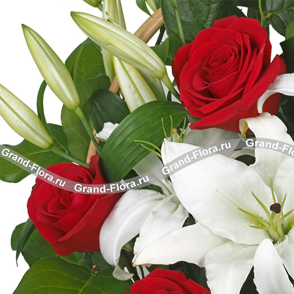 Стандартный (на фото): роза красная (50 см) - 9 шт., лилия белая - 2 шт., рускус, оазис, корзина.