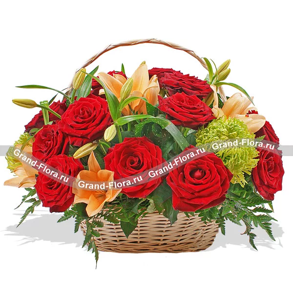Уменьшенный: роза красная (50 см) - 5 шт., лилия желтая (по сезону. возможна замена на белую) - 1 шт., хризантема одноголовая зеленая - 2 шт., салал, папаратник - 4 шт., оазис, корзина.