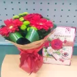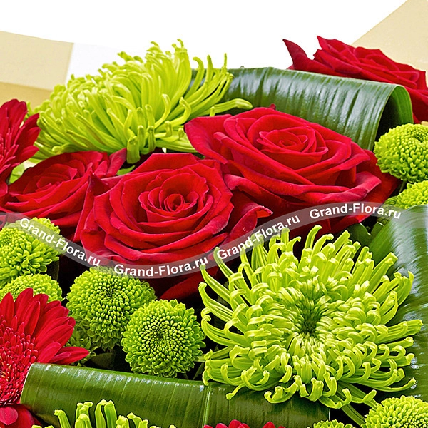 Стандартный: роза красная - 5 шт., гербера красная - 3 шт., хризантема одноголовая зеленая (шамрок) - 2 шт., хризантема зеленая сантини - 1 шт., лист аспидистры - 3 шт., фетр кремовый, бант красный.