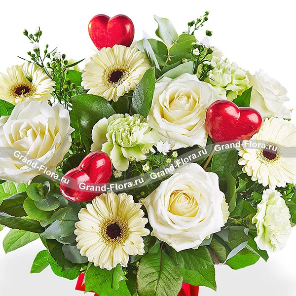 Стандартный (на фото): роза белая - 5 шт., гербера кремовая - 4 шт., гвоздика зеленая - 2 шт., рускус - 2 шт., гипсофила - 1 шт., эвкалипт - 1 шт., сердце красное (декоративное) - 3 шт., упаковка, бант красный. Примерный размер: 25Х25 см.