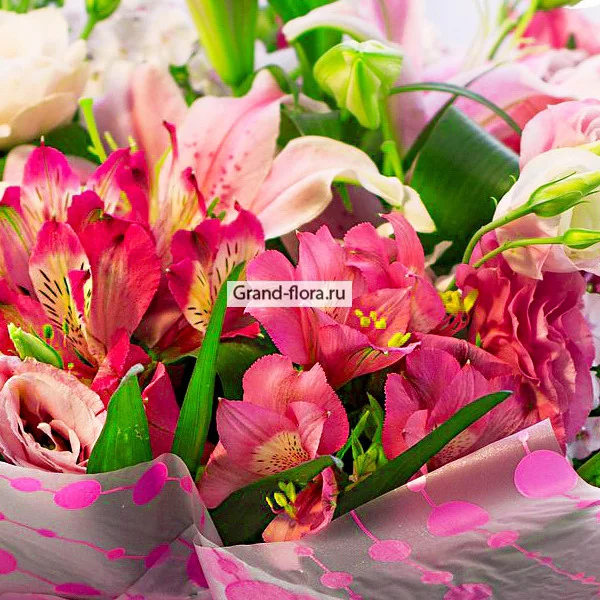 Нежно-розовый букет, с неповторимым ароматом, станет замечательным подарком на любое торжество. Богатая композиция из свежих цветов альстромерии, лилии и эустомы, удивит даже самого требовательного покупателя. Ураган нежности унесет вас в мир мечтаний и любви, прямо у вас дома или в офисе.