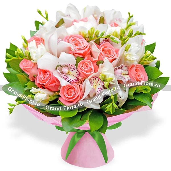 Стандартный: орхидея - 3 шт., роза розовая - 7 шт., фрезия белая - 5 шт., декоративная зелень, упаковка, лента.