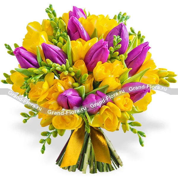 Стандарный: тюльпаны фиолетовые - 9 шт., фрезия - 12 шт., упаковка, лента.