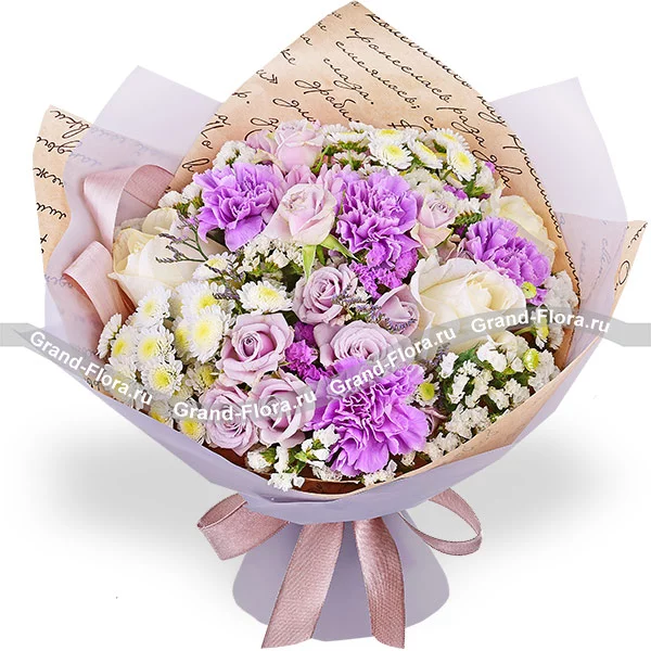 Сиреневый туман - букет из белых роз и гвоздик