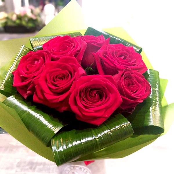 7 роз: роза красная - 7 шт. (Эквадор), лист аспидистры - 4 шт., упаковка, лента.