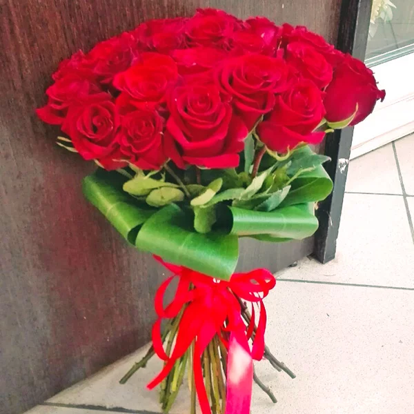 21 роза: роза красная - 21 шт. (Эквадор), лист аспидистры - 4 шт., упаковка, лента.