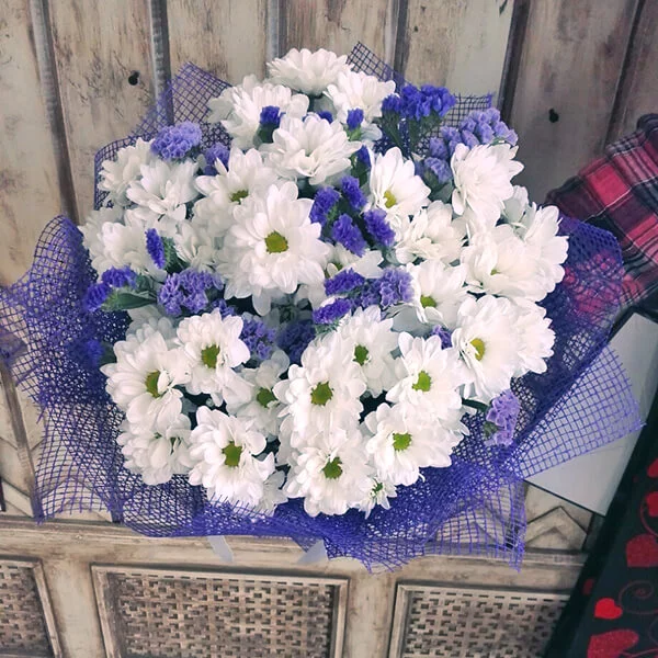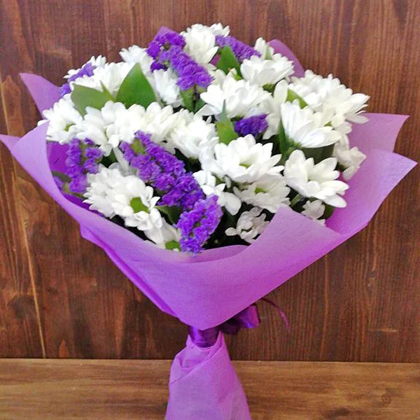 хризантема белая кустовая ромашковая - 7 ., статица - 3 шт., салал, фетр фиолетовый. Примерный размер: 25Х30 см. Данный букет представлен на фото