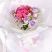 Роза кустовая светло-сиреневая (возможна замена на розовую) - 2 шт., альстромерия розовая/фиолетовая– 2 шт., гиперикум белый – 1 шт., статица светло-фиолетовая (сиреневая) – 1 шт., упаковка, лента.