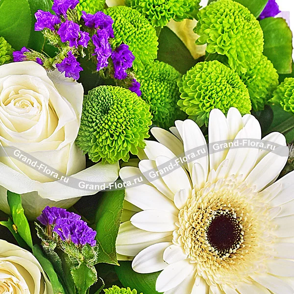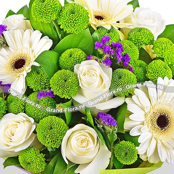 ДЕЛЮКС: роза белая - 15 шт, гербера белая - 9 шт, хризантема кустовая зеленая - 10 шт, статица - 7 шт, салал, фетр из двух слоев - зеленый и фиолетовый, лента. Примерный размер: 45Х45 см.