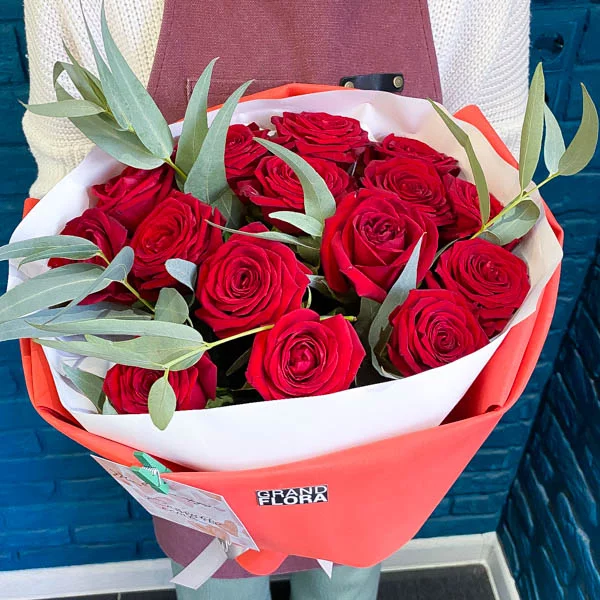 Букет из красных роз, гармонично дополненный эвкалиптом, станет отличным поздравлением как для женщин, так и для мужчин.